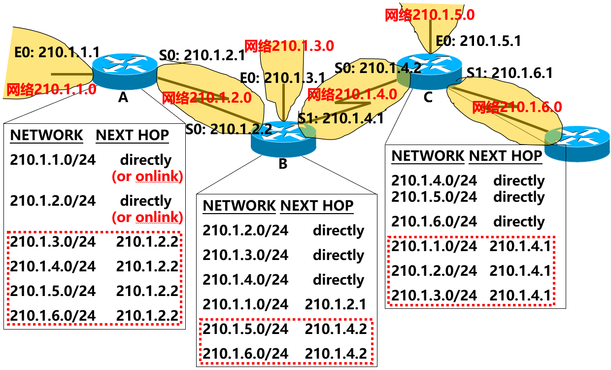 每个路由器上都有一个路由表, 手动配置或者根据路由协议自动生成, 对于 Internet, 每增加一个网络, 必须在路由表中建立该网络网络号所对应路由表表项.