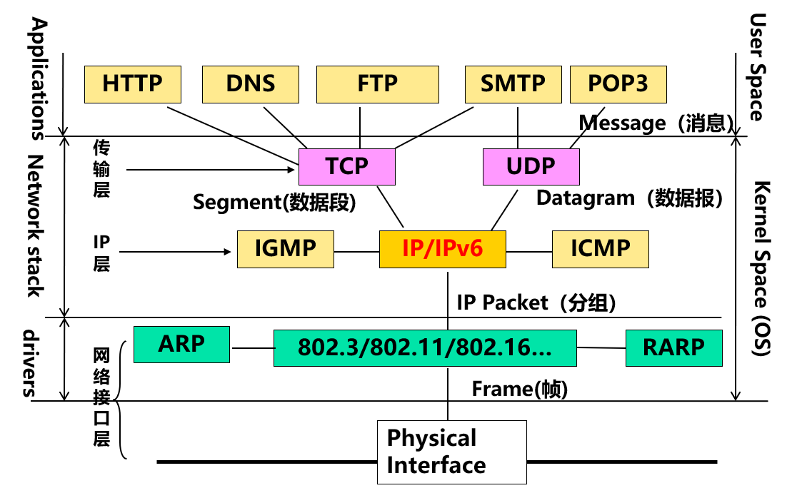 不同网络采用的数据链路层和物理层协议可能不同, 对于这种网络, 可以采用相同的网络层协议实现它们的互连. 对于 Internet, 这个协议就是 IP, 使用的网络互连设备就是路由器.