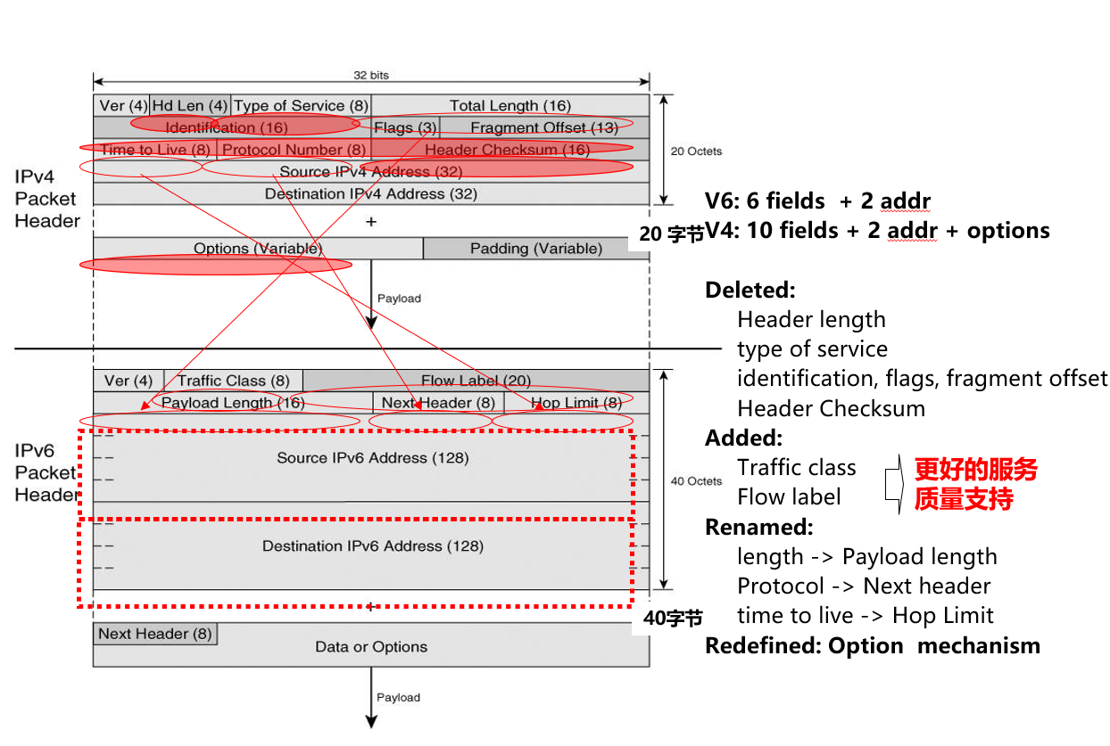 - 简化头标: 去掉了校验和, 分段等 IPv4 网络中的路由器操作, 提高路由器处理效率