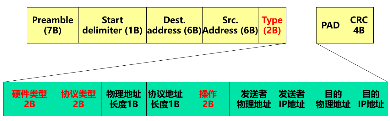 注: 帧的目的 MAC 地址始终为转发 IP 分组的下一跳网络节点的 MAC 地址, 因此在执行 ARP 协议之前首先要查找转发表, 得到下一跳网络节点的目的 IP 地址, 下一跳网络节点可能为目的主机, 也可能为路由器, 然后再执行 ARP 过程