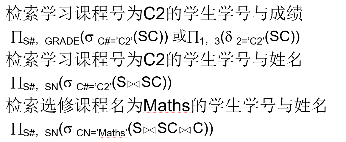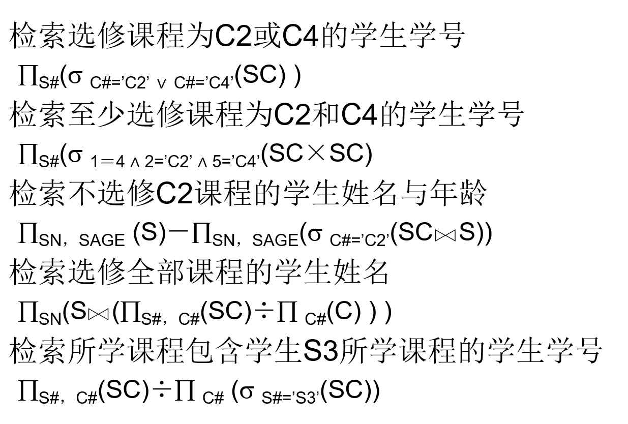 - 关系操作: 对表的操作, 选择, 投影, 连接, 除, 并, 交, 差等查询以及增, 删, 改