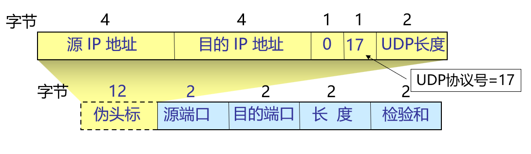注意: 伪头标只在校验和计算过程中使用, 不会用于实际 UDP 数据段传输.