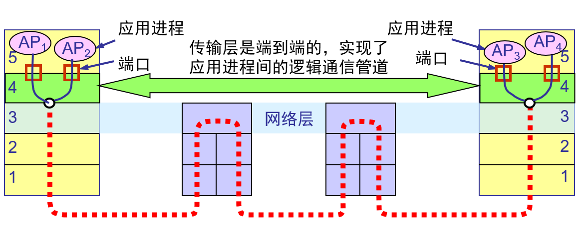 主机上的每个应用进程与不同的传输层端口相关联, 因此, 传输层提供了运行在不同主机上的应用进程之间的逻辑通信管道, 管道的两端由端口来标识.
