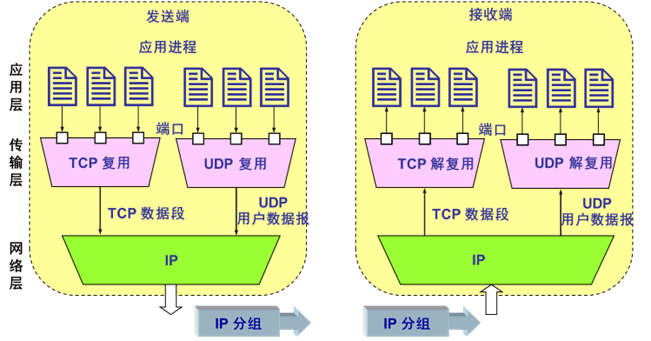 - 传输层根据接收到的 TCP/UDP 协议数据单元中包含的端口信息将其递交给与该端口关联的网络应用进程