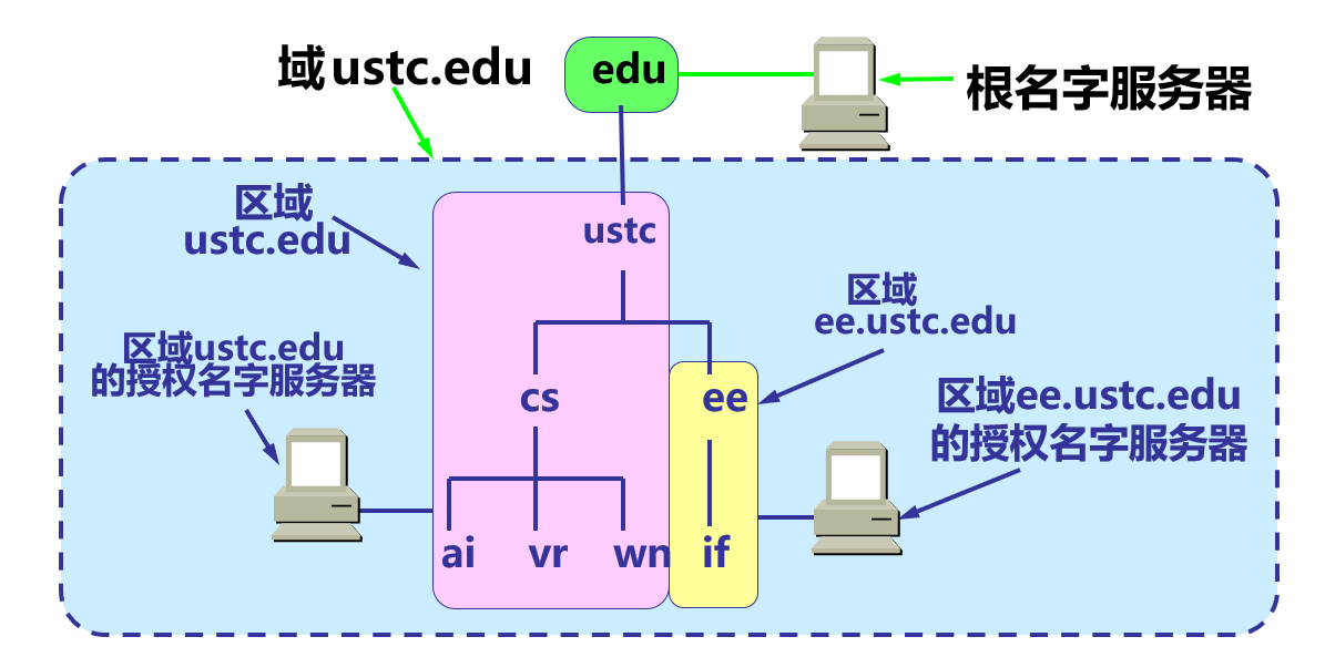 Internet 允许各个组织根据具体情况将本组织内的域划分为若干个区域 (zone), 并在各区域中设置相应的授权名字服务器.