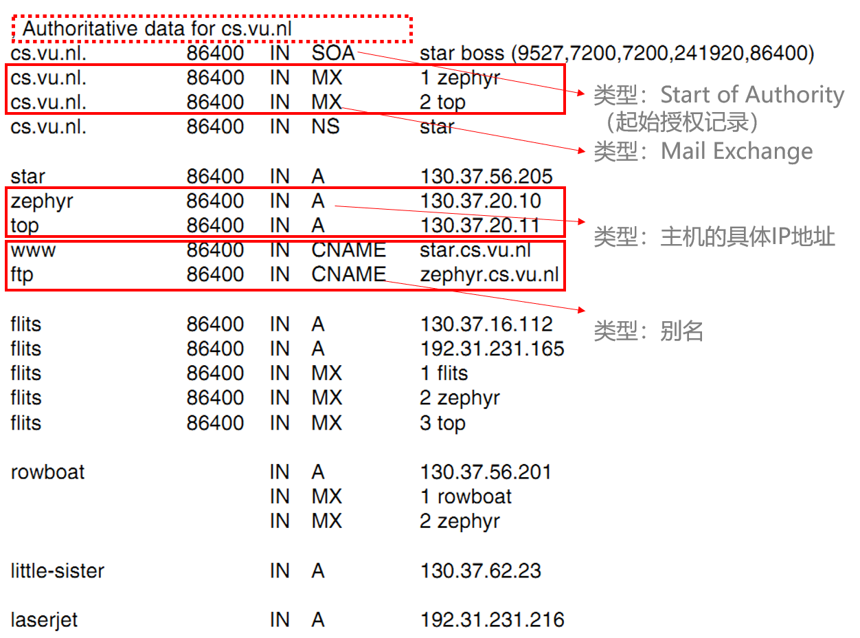 - 权威记录 Authoritative Record, 来自管理该记录的授权名字服务器, 因此总是正确的. 例如 eeis.ustc.edu.cn 在 ustc.edu.cn 域所对应的名字服务器所管辖的范围内, 因此该名字服务器返回的关于 eeis.ustc.edu.cn 的记录为权威记录.